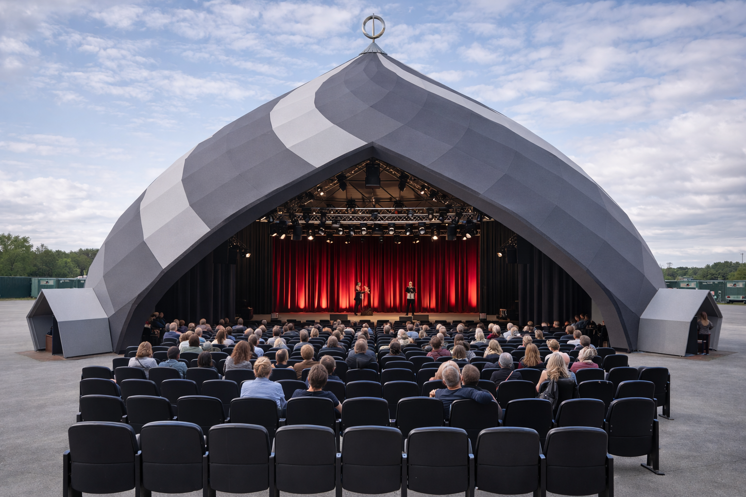 El Zome és una estructura d’acer fabricada al MOLÍ XIC, dissenyada per oferir una gran flexibilitat i adaptar-se a diferents tipus d’esdeveniments. Gràcies a diverses configuracions de coberta (toila), l’ampliació de l’espai pot ser modulada segons les necessitats específiques de cada esdeveniment.